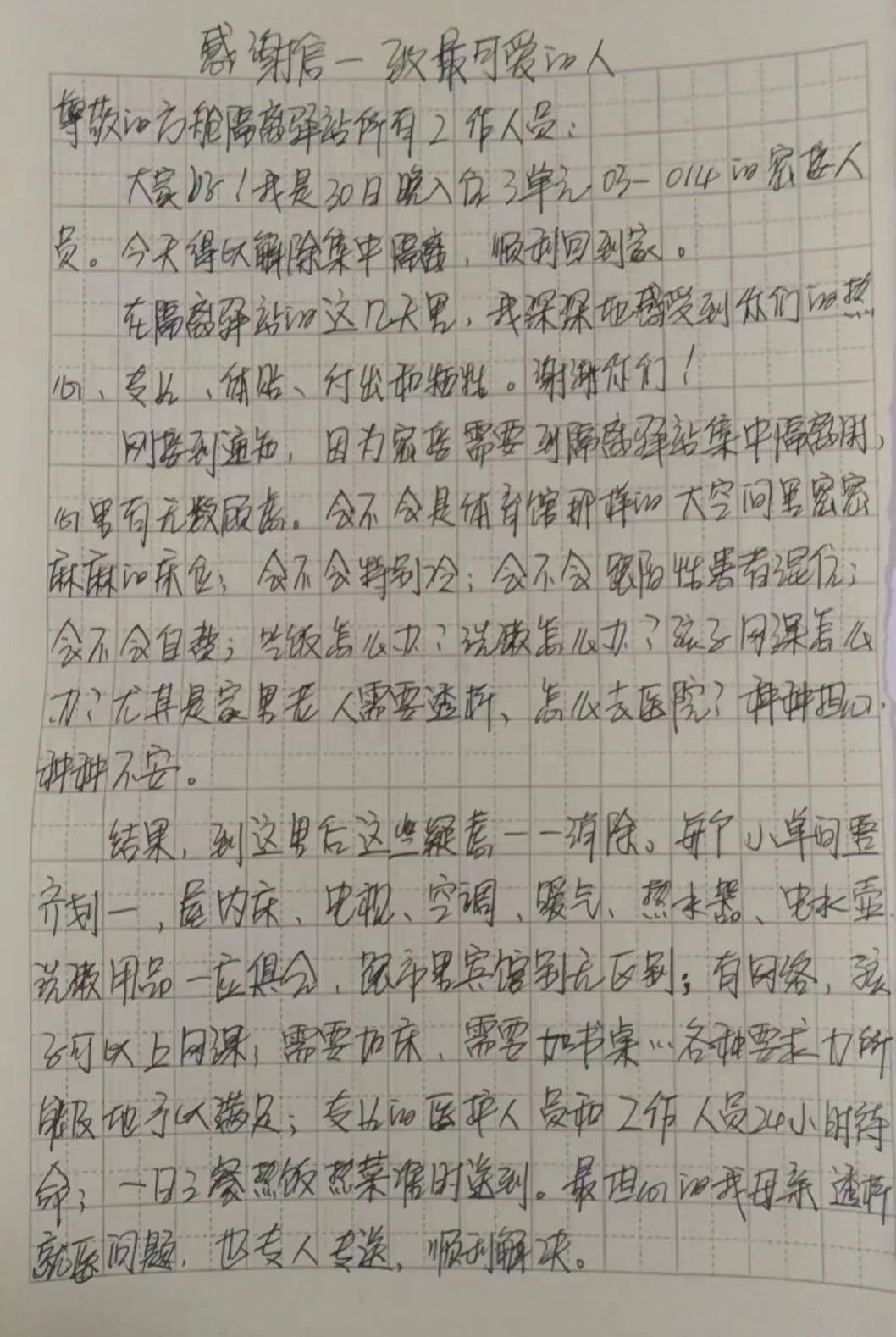 在隔離驛站的這幾天里,我深深地感受到你們的熱心、專業(yè)、體貼、付出和犧牲。謝謝你們!