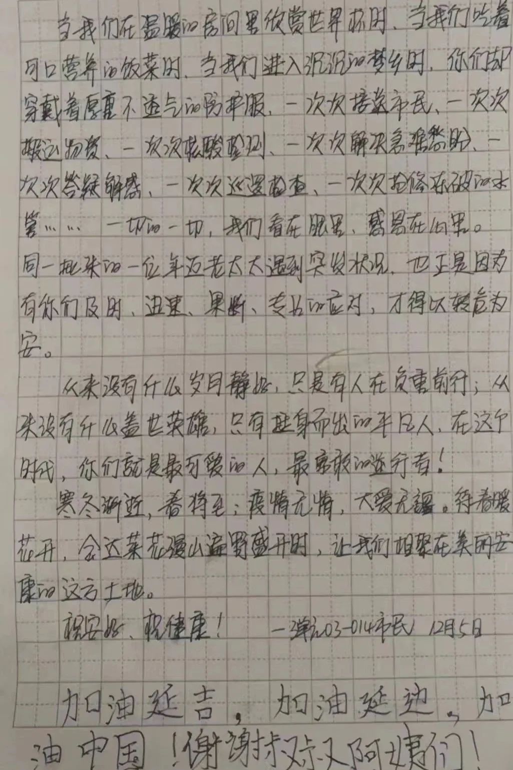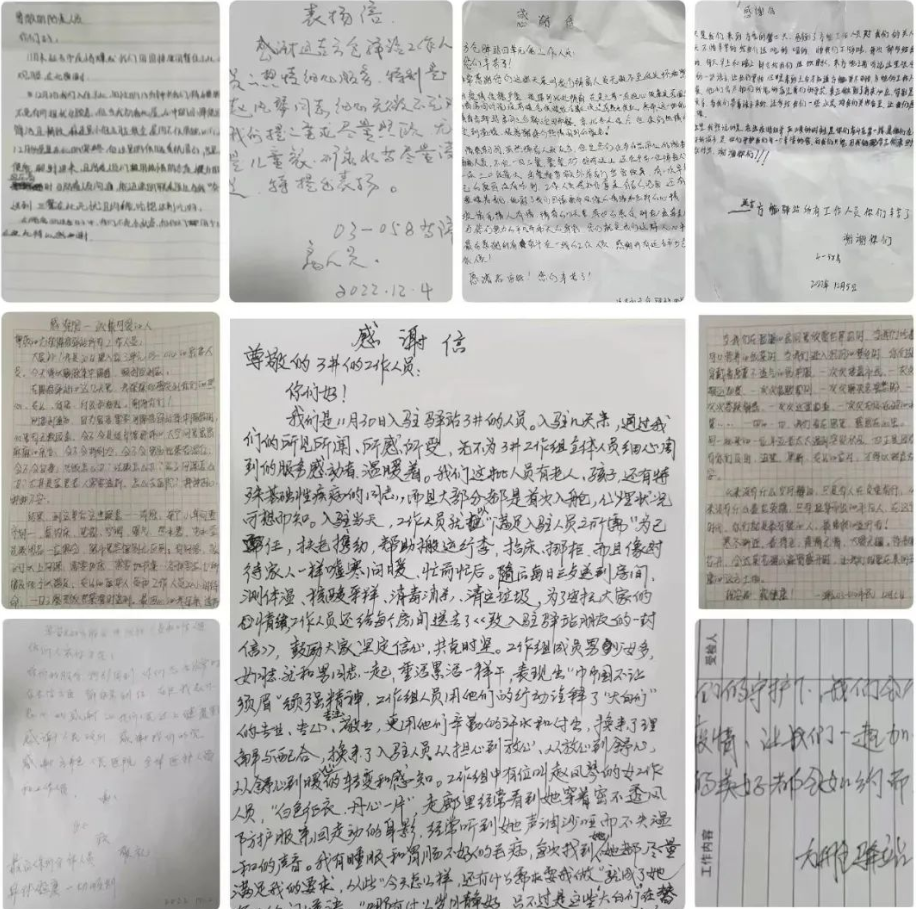 小棉襖集團(tuán)管理團(tuán)隊(duì)自11月27日入駐延吉市方艙驛站以來,陸續(xù)收到了許多客人的表揚(yáng)信,信中真摯的話語、熱烈的情感像冬日的暖陽般充滿正能量,下面讓我們一起重溫表揚(yáng)信中那些真摯的話語所帶來的溫暖吧!